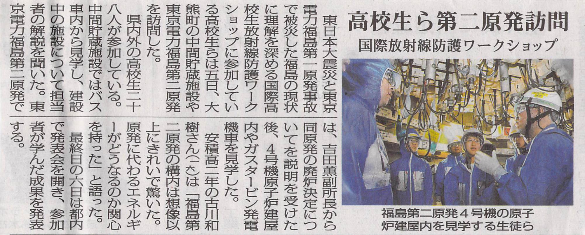 ・私のように、福島に住んでいても正直状況を理解している人はあまり多くないと思います。そうではありますが、私たちは同じ県に住んでいる身として、自分から働きかけて正しい情報に耳を傾け、自分の頭で考えるべきであると今日の体験を通して強く感じました。このような今日の体験で感じた様々なことを胸に刻んで、今後の人生において活かしていきたいと思います。 (2年男子)