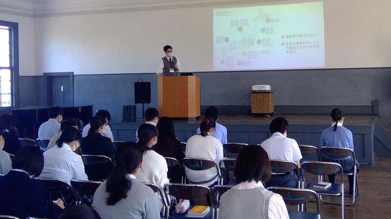 2022年10月5日 09時50分10月1日(土)1学年生徒を対象に学部学科探究が行われました。8つの学問分野(法・文・経・教・工・医・理・農)にわたり、本校を卒業した大学生や大学院生からそれぞれの学部学科の内容を直接聞き、理解を深める機会となりました。生徒は希望する講座を2つ選択し、先輩からの説明に真剣に耳を傾けていました。講座終了後活発に質疑応答が行われ、控室に戻ってからも時間が許す限り後輩の質問に熱心に答える講師の先輩もいました。